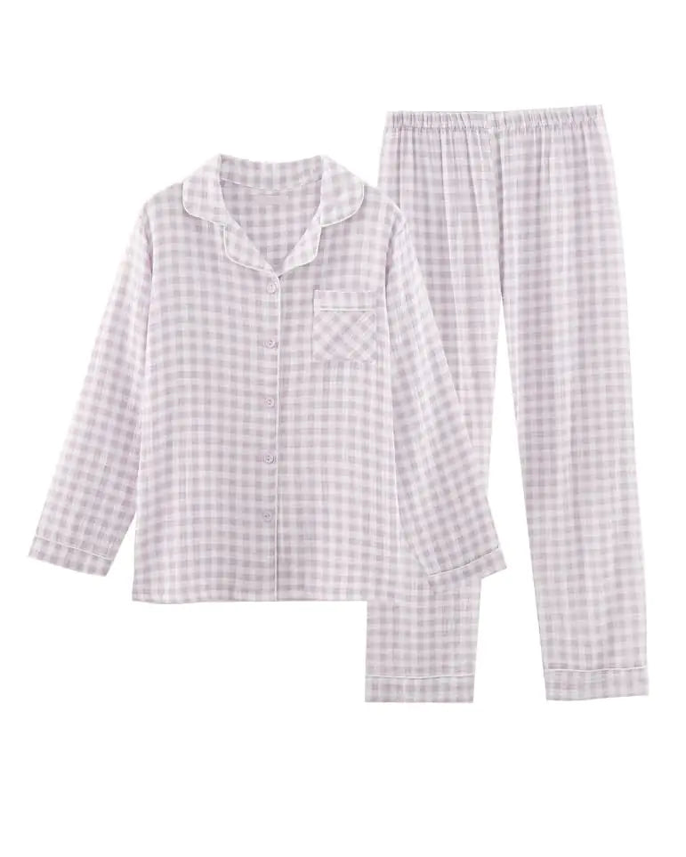 Womens pajama set made of 100% cotton gauze soft lightweight and cozy fabric superbly breathable. skin friendly fabric makes you more comfortable to wear also can wear as postpartum pajamas.