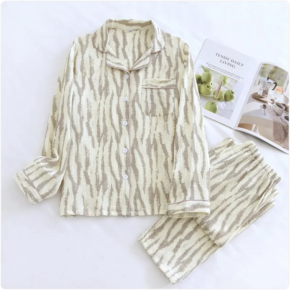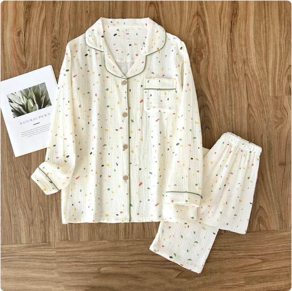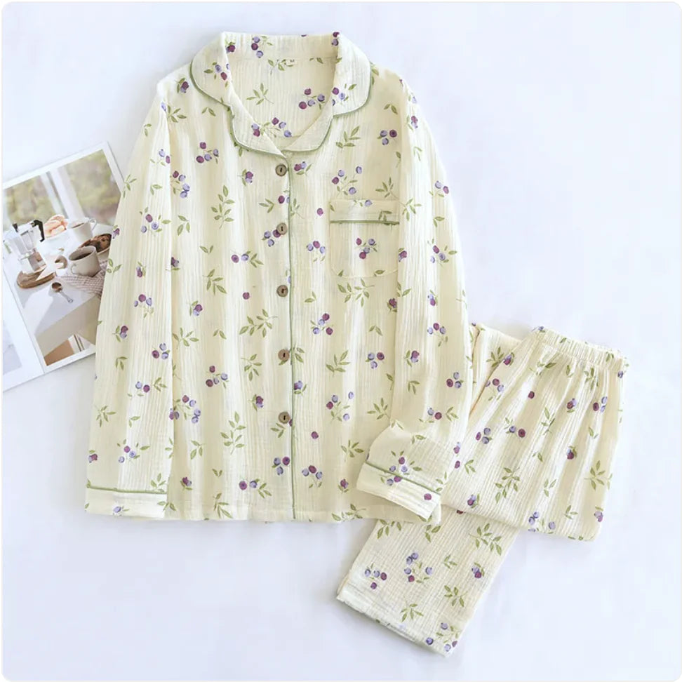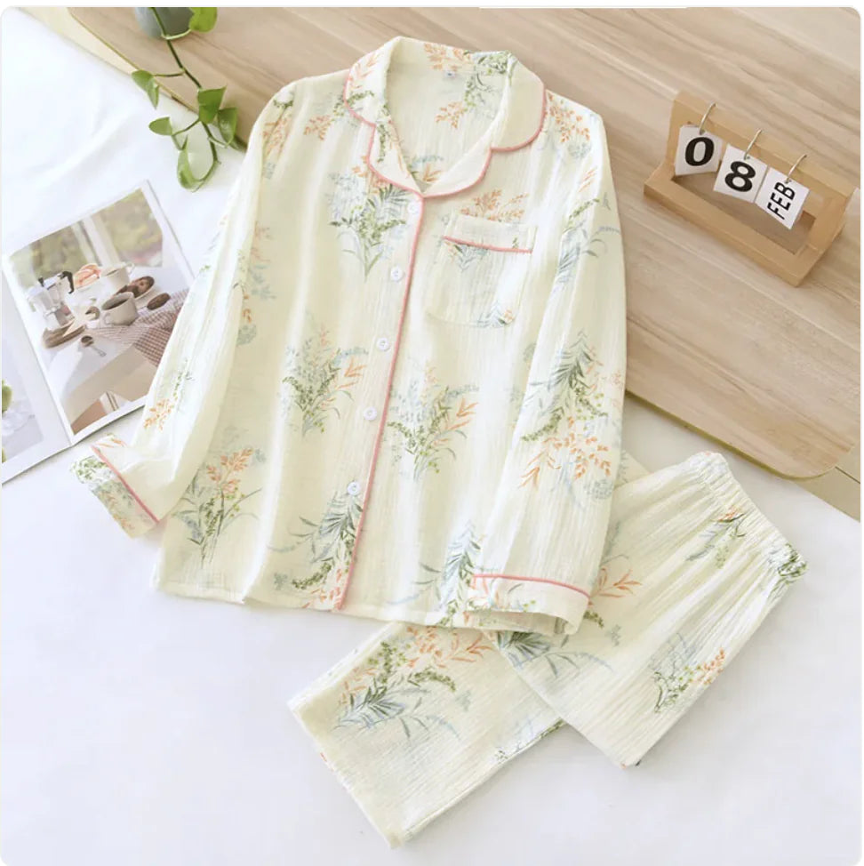 This comfortable and stylish women's homewear set is made of soft cotton fabric, perfect for relaxing at home. The set includes a long-sleeved top and long pants, designed for a cozy fit with a navy collar and a variety of charming patterns. Choose from a range of fun designs, including floral, animal, and fruit motifs in both beige and white color options.