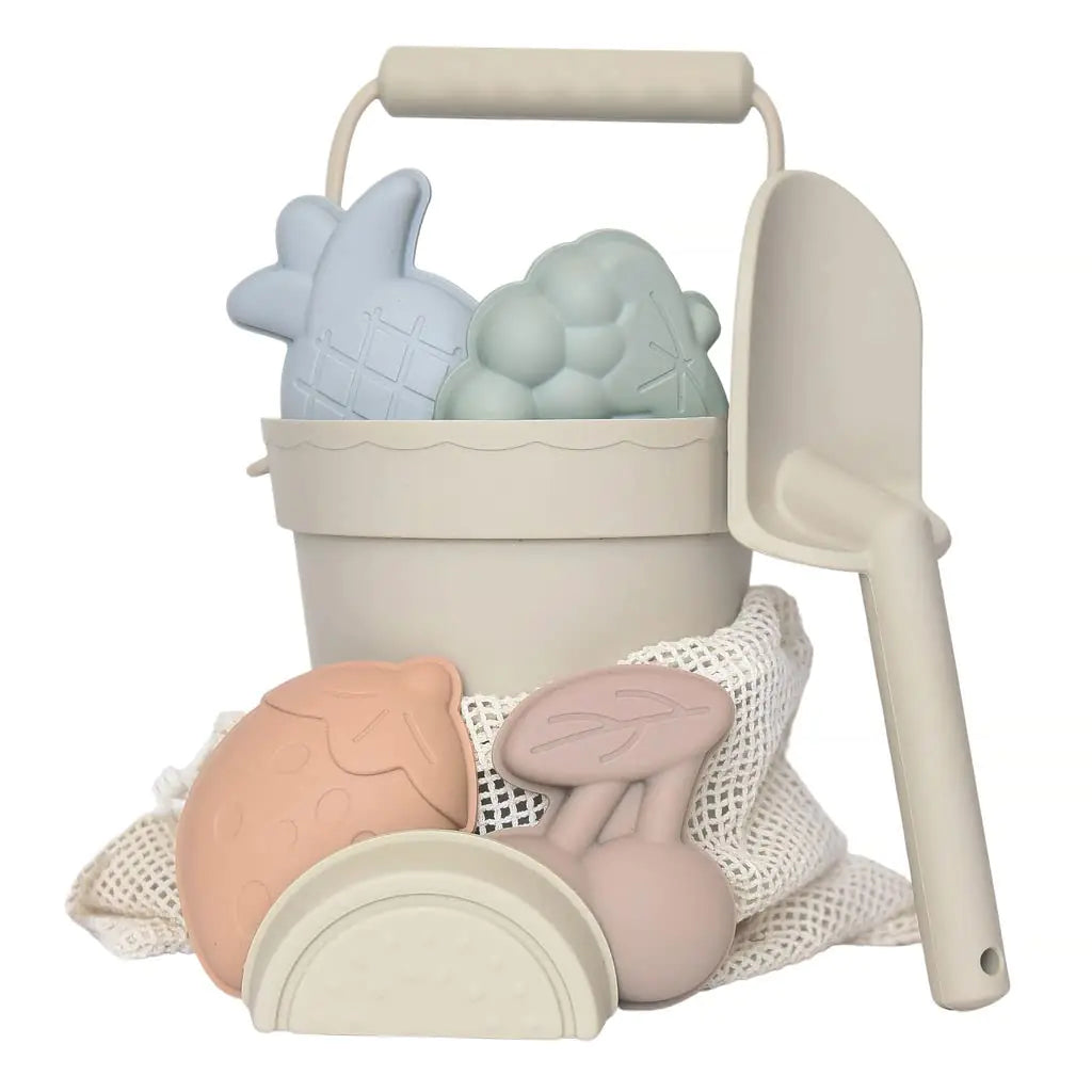 Our silicone beach toy set is crafted from eco-friendly materials making it safe for your little ones and the environment. These sand toys for toddlers are perfect for creating fun beach memories while being gentle on the planet. Easy to Clean: Designed for convenience these toddler beach toys are simple to clean. Just rinse with water and they’re ready for the next adventure. Perfect for busy parents looking for hassle-free beach essentials for babies and kids. Complete Beach Toy Set: This beach sand toy set includes 5 fruit sand toy moulds a shovel and a beach bag offering endless fun for kids. Ideal as beach toys for toddlers this set provides everything needed for a great day at the beach. Travel Friendly: Compact and lightweight this silicone beach toy set fits easily into the included beach bag. Perfect for on-the-go families these beach toys for toddlers ensure your little ones are always ready for a fun-filled day whether at the beach or on vacation. Modern Fun Play: Our beach toys are designed with children in mind featuring soft flexible silicone that is gentle on little hands. Our silicone beach set encourages imaginative play and motor skill development. Dimensions: Bucket: W: 5.9 inches x H: 5.5 inches; Capacity 33.8 oz; Small Shovel: L: 8.6 inches; Cherry: 3 inches; Watermelon: 3.5 inches; Pineapple: 3 inches; Strawberry: 3 inches; Cotton Mesh Tote: L: 11.5 inches; W: 10.5 inches; Grapes: 3.7 inches]